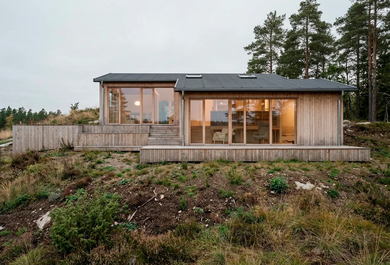 The extension at Kratbakken 13 is rooted in the steep terrain ofthe Mols area and uses the natural level differences as an architectural asset rather than a constraint to be flattened. The project is organised around a deliberate change in level, creating a calm transition between the existing summer house and the new extension.