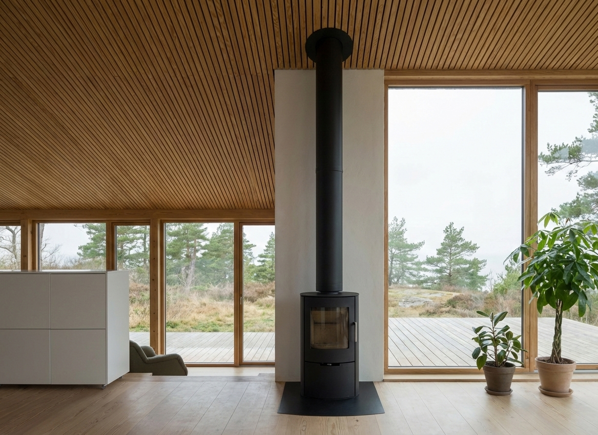 The untreated cedar wood façade was chosen for its tactile quality and its ability to weather naturally over time. The initially varied tones gradually develop into a soft, silvery-grey surface that reinforces the building’s relationship to its natural surroundings. A light and discreet roof overhang is integrated as a precise architectural detail, giving the roof a sense of lightness while improving the long-term performance of the façade.