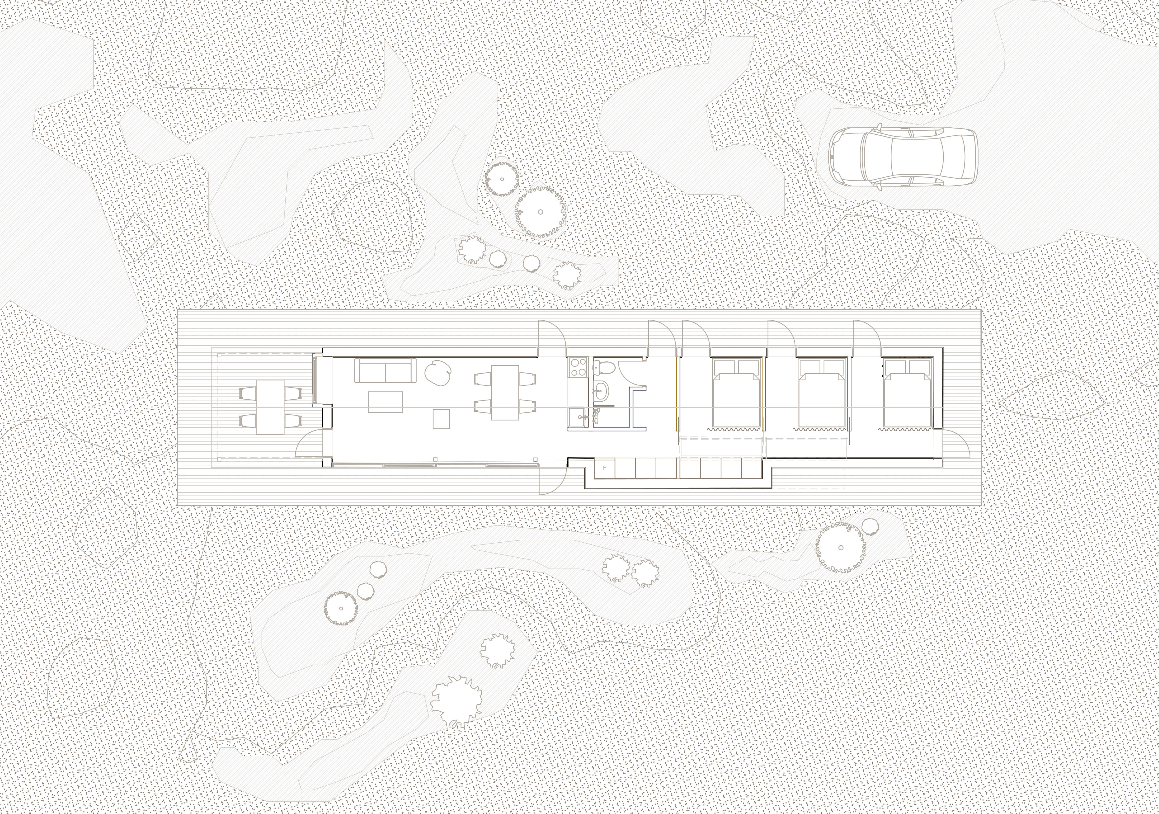 Towards the east, the pace of the house changes. This area contains two minimal sleeping cabins designed for quiet and reflection. With individual exits and skylights, these rooms are not about outward observation, but rather about inward calm and the experience of the deep silence found within the woods.