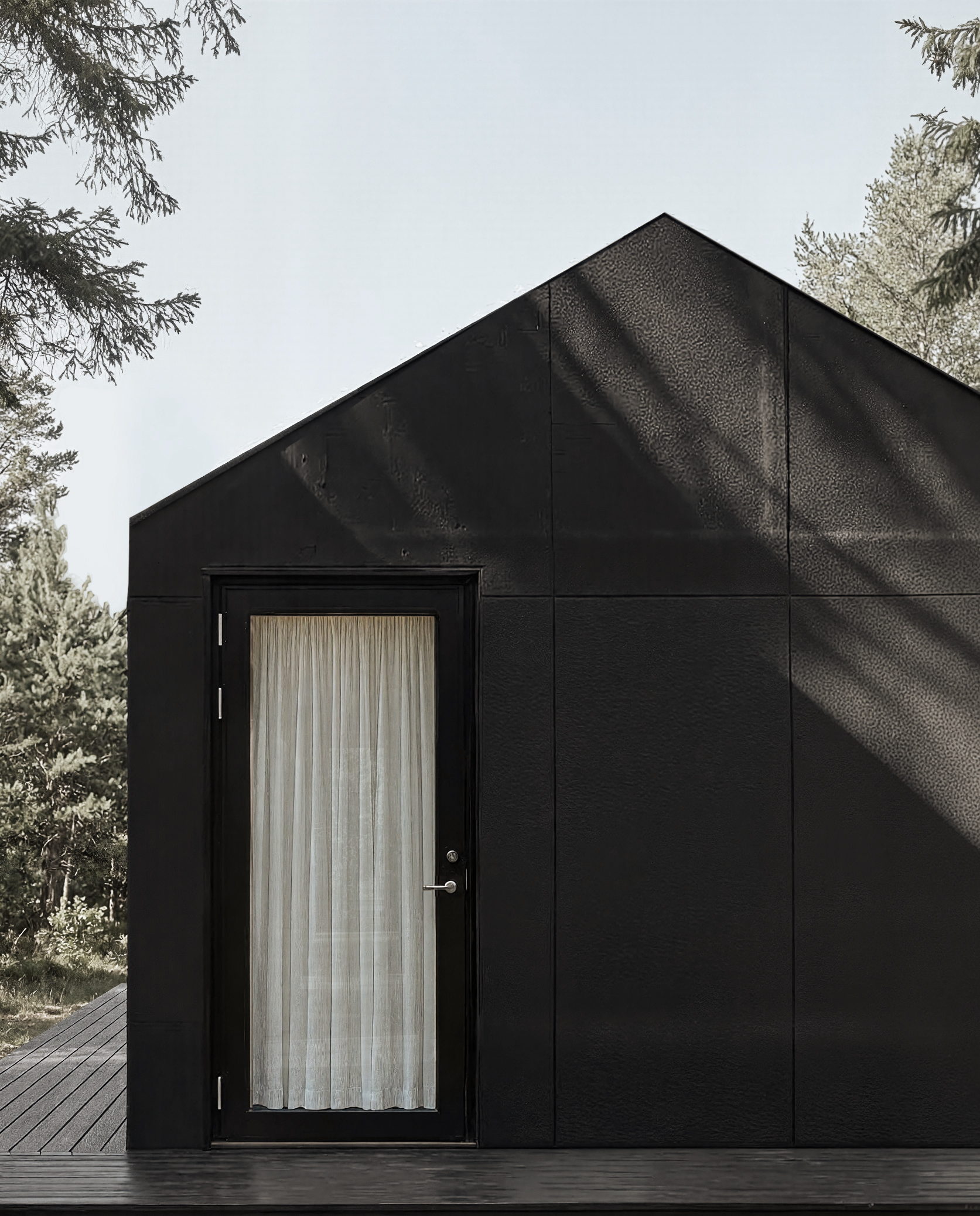 The structure is based on a simple and honest post construction, where roofing felt covers both the roof and the exterior walls. By omitting gutters, the house maintains a sharp, monolithic silhouette that allows the dark surfaces to recede into the shadows of the pines, making the building feel like an integrated part of the woods.
