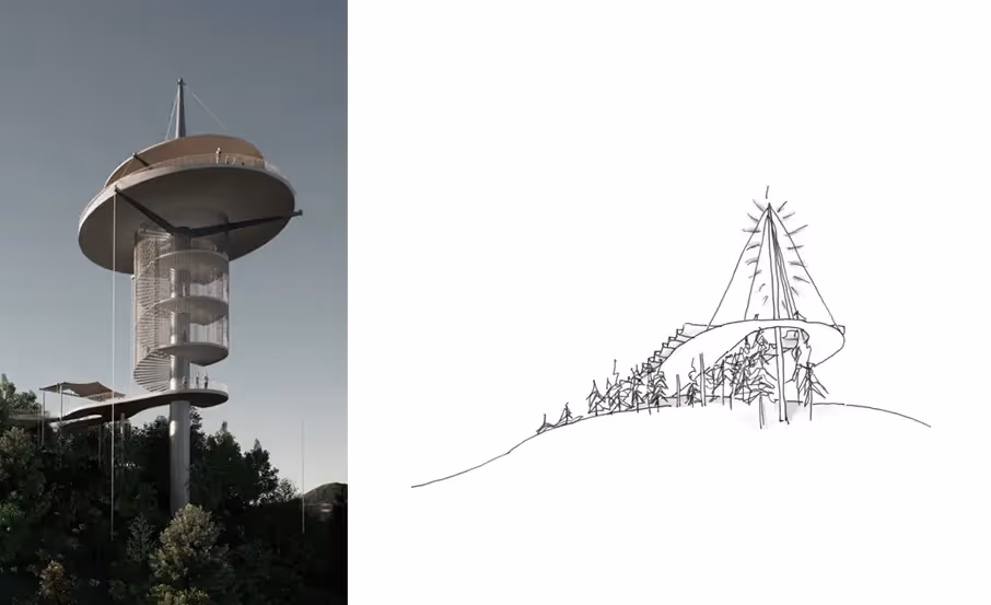 The first tower, located in a pine forest, draws inspiration from the natural form of a pinecone. Its intricate system of suspension cables creates both structural lightness and an organic architectural expression, blending with the forest setting.