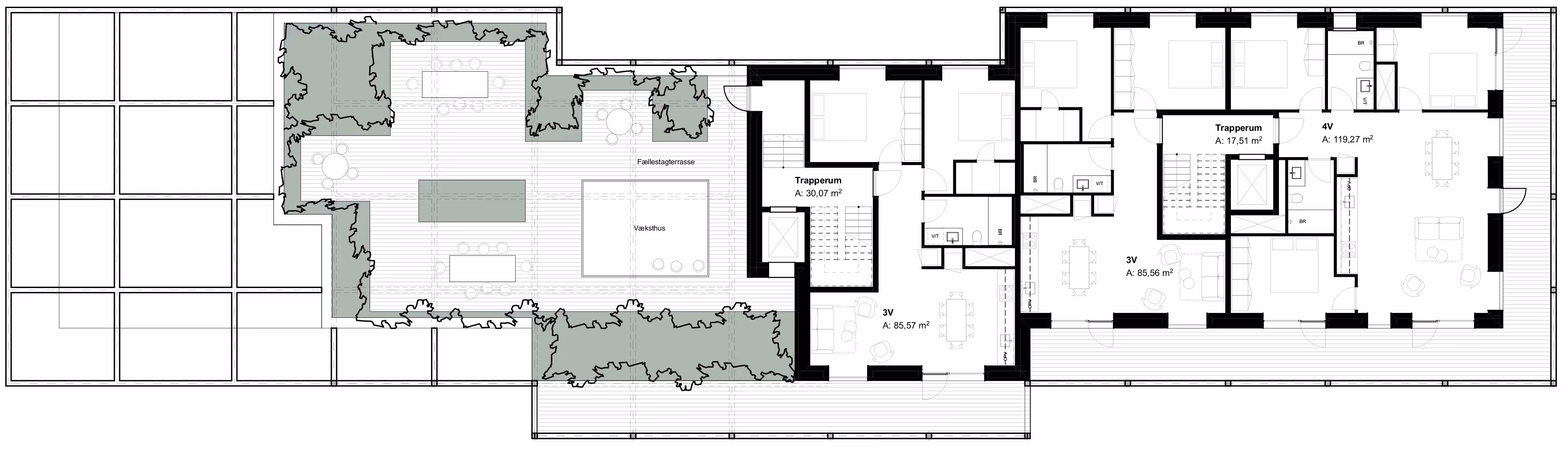 The housing development offers flexible, modern homes for families, co-living communities, and blended households. With a focus on social sustainability, the project balances private, semi-private, and shared spaces to support both community and personal life. Built in warm, natural materials—primarily timber—the architecture conveys a calm and harmonious character. Spacious apartments are complemented by rooftop terraces and a greenhouse where residents can gather, grow vegetables, or enjoy the greenery. Ground-floor communal areas and small outdoor zones encourage everyday encounters and an active neighborhood life.