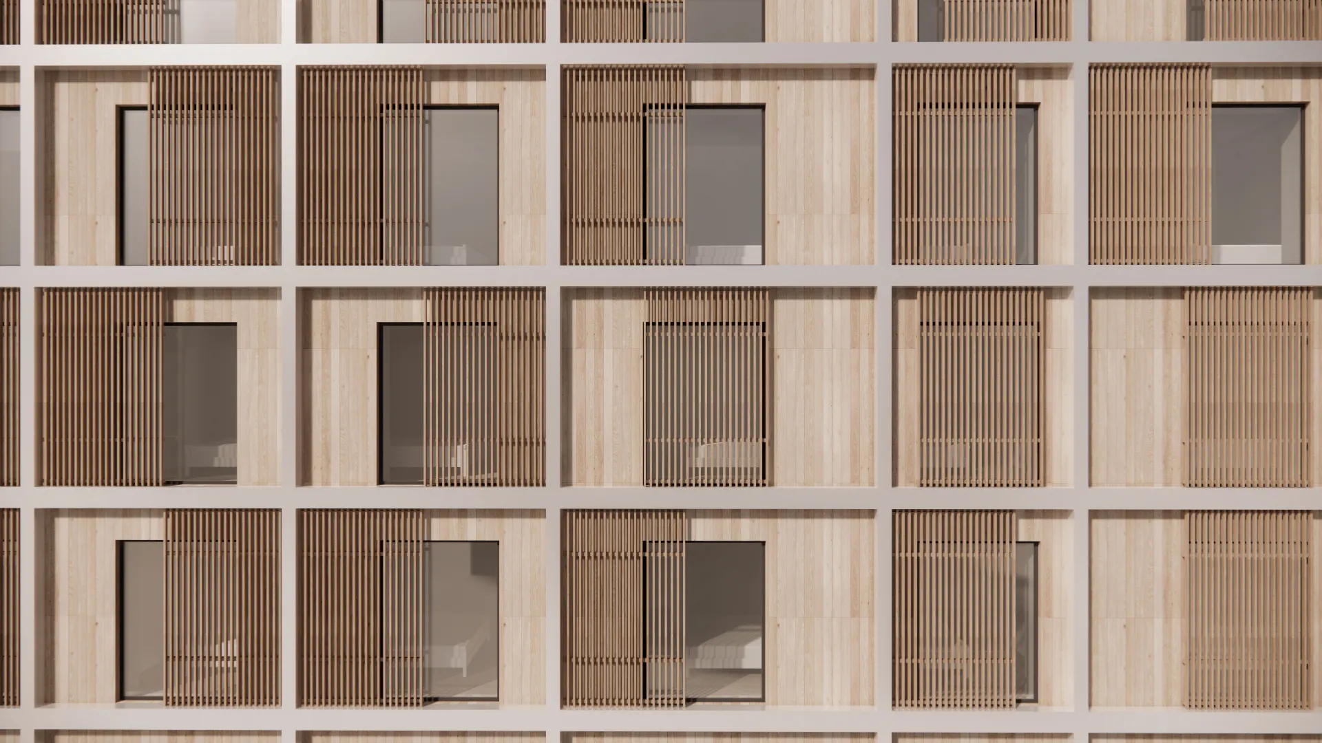 Over time, the timber façades will patinate beautifully, reinforcing the natural expression. Generous balconies and green terraces integrate planting and wooden details, while a rooftop greenhouse creates a soft link between architecture and nature—where residents can grow herbs or enjoy a peaceful green space in the city. The south façade opens toward the square, while the north side appears more private, shielded by sliding timber louvers. Wood unites the building in one coherent, tactile whole.