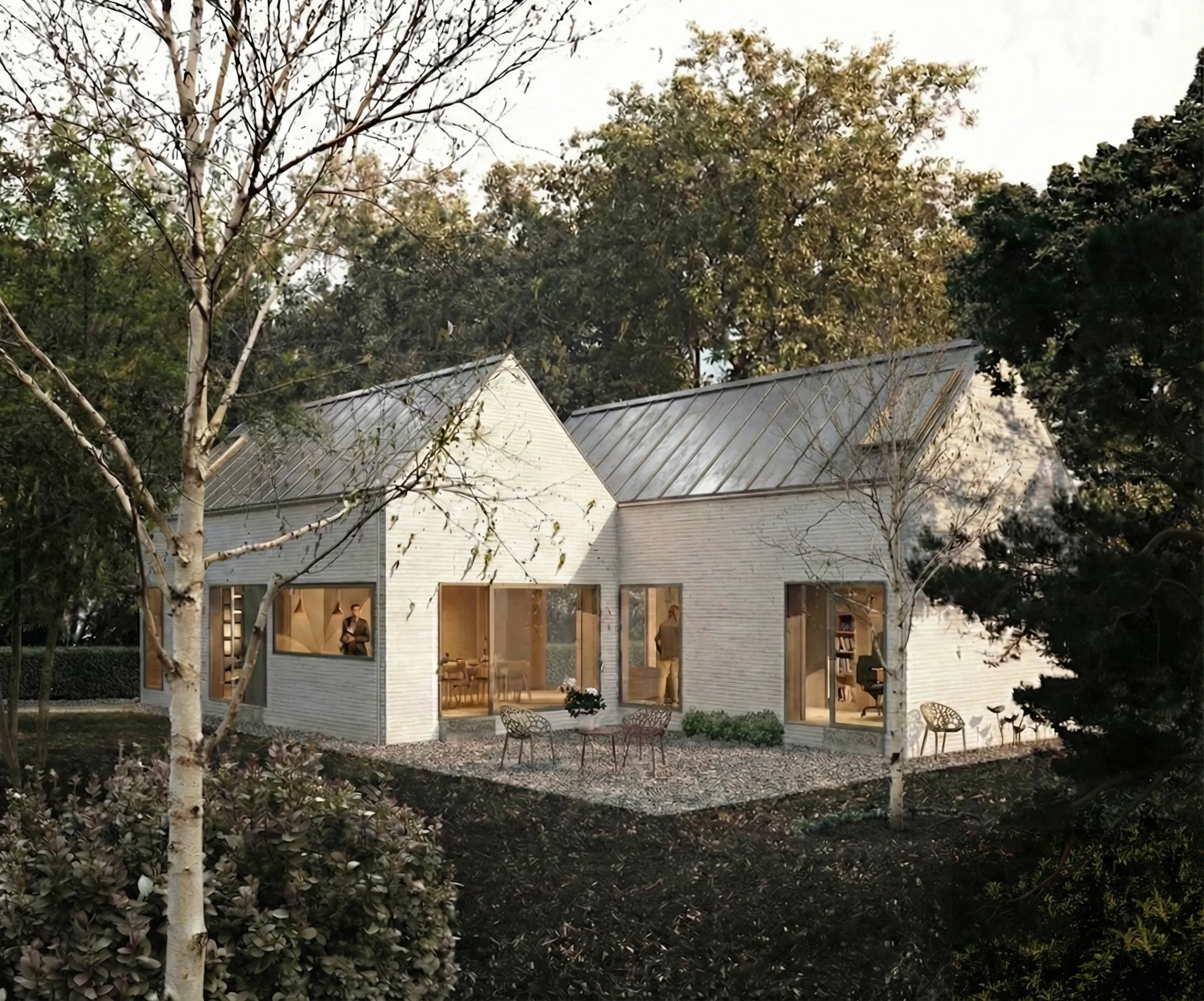 The family commissioned a concept design for their future vacation home, envisioned as a modest house featuring a spacious living/dining/kitchen area and three bedrooms in total. They requested two terraces: one for summer dining and another for more informal gatherings. The house is designed as a classic light brick home with a gabled roof in a neutral color, complementing both the surrounding environment and neighboring houses. Maximizing natural sunlight throughout the interior was a key priority for the family.